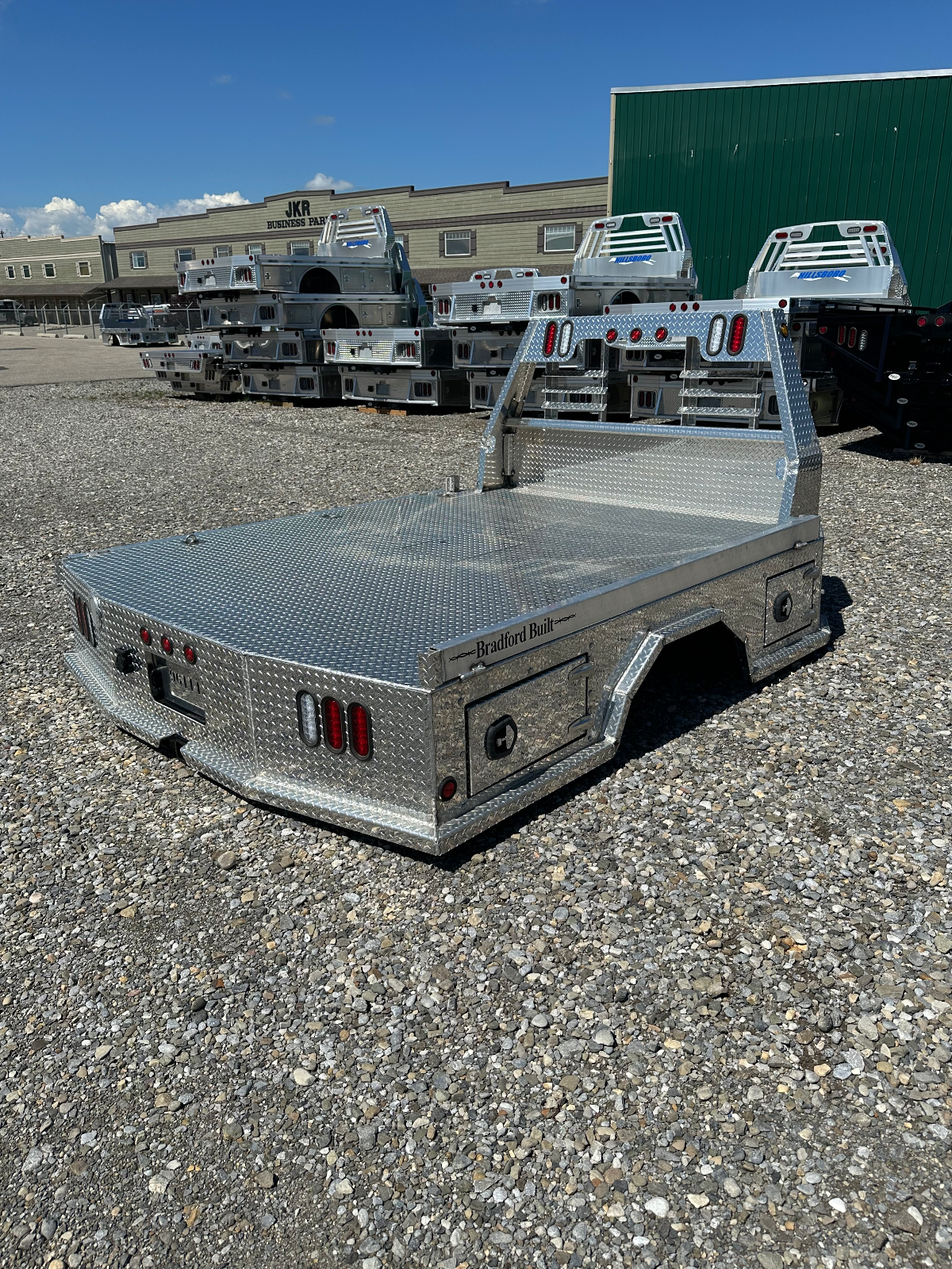 The Bradford Built Aluminum 4-Box Utility Bed is built for professionals who need both storage and strength. This all-steel utility bed integrates four underbody toolboxes (two per side), offering ample, secure storage for tools and equipment without sacrificing bed space. Crafted from 1/8″ tread-plate steel, the deck, skirting, and headache rack are built to withstand rugged jobsite conditions. The bed includes 4″ flip-down side rails on greasable hinges for flexible loading, plus recessed D-rings and stake pockets for reliable tie-downs. It features a 30,000 lb gooseneck hitch and a Class IV receiver hitch for serious towing capability. The formed steel headache rack comes with integrated LED lighting and flush-mounted beam lights for safety and visibility. Finished in a black powder coat to fight rust and maintain a clean industrial look, the 4-Box Utility Bed is an efficient, durable solution for service trucks, construction fleets, and maintenance rigs.