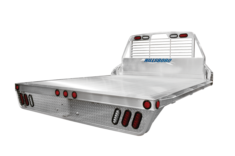 Crafted from high-strength extruded aluminum, the Hillsboro 2000 Series enhances payload efficiency without compromising durability. It features 3″ aluminum I-beam crossmembers spaced ~16″ apart, an extruded rubrail, and tie-rails with integrated stake pockets for secure cargo tie-down. The adjustable-height headache rack uses square-tube louvers, and LED lights (stop/turn/tail + backup) provide visibility. Structural steel channel long sills adjust to 34″, 38″, or 42″ frames, and a 30K gooseneck plate with flush cover supports towing. With a 3-year structural warranty, the 2000 Series Aluminum flat deck delivers lightweight strength and corrosion resistance — ideal for service trucks and commercial applications