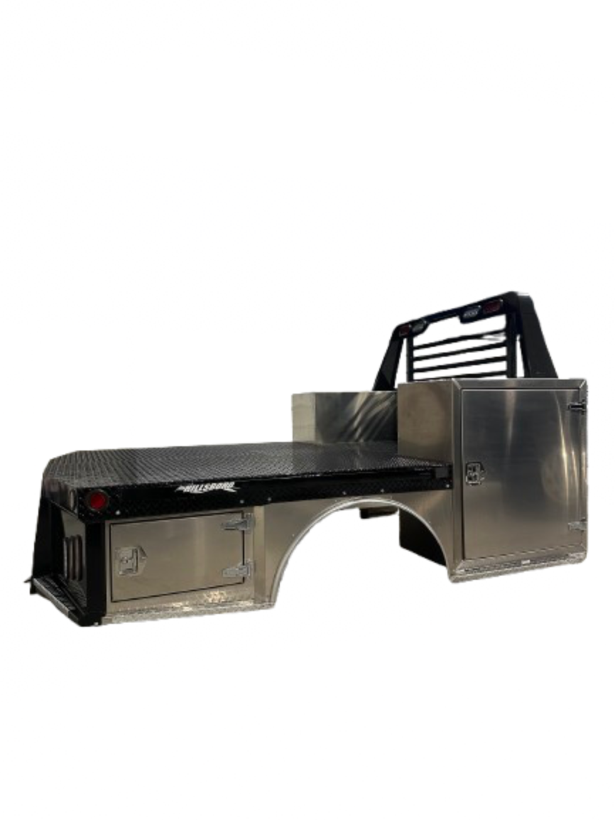 The new Steel TX flat deck from Hillsboro represents the future of steel bed engineering. Constructed with robust 1/8th″ treadplate steel and finished in epoxy primer plus black polyurethane paint, the Steel TX offers outstanding corrosion resistance and strength. It features a welded structural frame, adjustable long sills, LED lighting for stop, turn, tail, backup, and markers, and a sealed plug-in wiring harness for reliable electrical performance. A 30K gooseneck ball plate provides serious towing capability, while inboard stake pockets and rope ties let you secure even complex loads. Backed by Hillsboro’s 2-year warranty, the Steel TX combines modern design, top-tier durability, and commercial-grade utility.