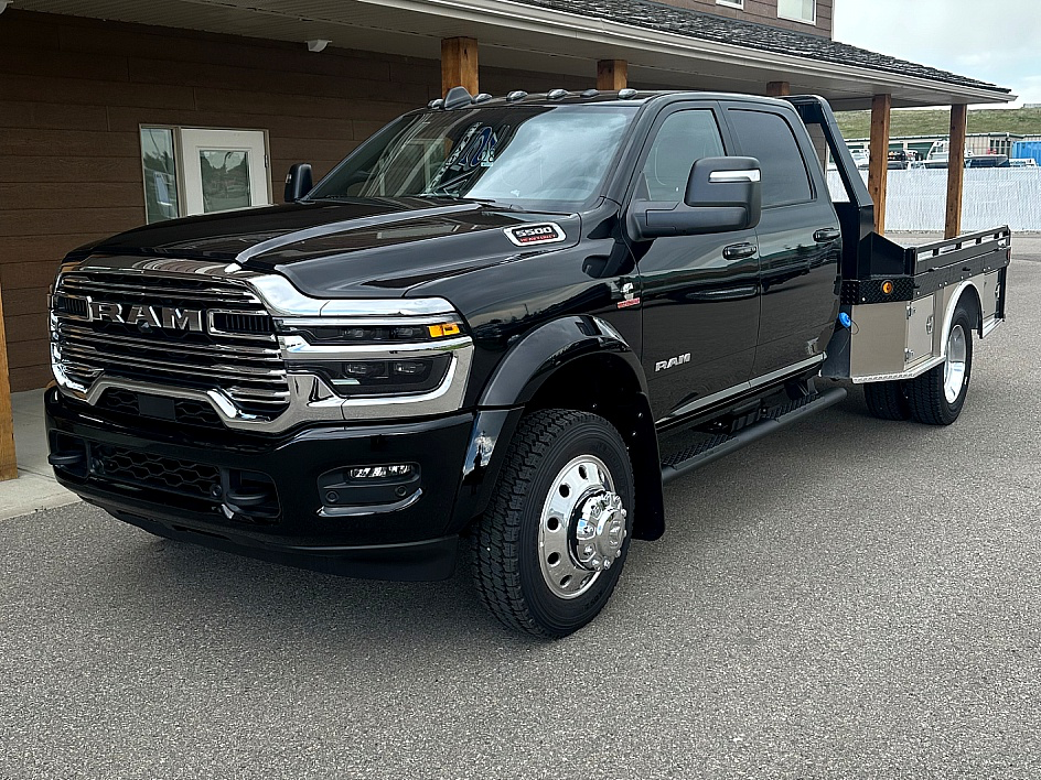 Introducing the 2024 Ram 5500 Laramie Crew Cab Chassis with a 60” Cab-to-Axle (CA) configuration, finished in a striking Diamond Black exterior. This heavy-duty vehicle offers a seamless blend of luxury, performance, and functionality, making it an excellent choice for professionals seeking a reliable and versatile work truck. The 2024 Ram 5500 Laramie Crew Cab with the 6.7L Cummins® engine and 4.44 axle ratio is designed to meet the demands of various industries, including construction, agriculture, and logistics. Its robust build, luxurious features, and customizable options make it a versatile asset for any commercial fleet. Performance and Capability: • Powerful Engine: The 2025 Ram 5500 Laramie is powered by the 6.7L Cummins® Turbo Diesel I6 engine, delivering 360 horsepower and 800 lb-ft of torque. This robust powertrain ensures exceptional towing and hauling capabilities. • Transmission: Equipped with the durable 8–Spd TorqueFlite HD Auto Transmission, optimized for heavy-duty performance and smooth power delivery. • Axle Ratio: Featuring a 4.44 axle ratio, the Ram 5500 Laramie balances power and efficiency, enhancing its towing and payload capabilities. • Suspension: Outfitted with heavy-duty shock absorbers and anti-roll bars, providing stability and a smooth ride under various load conditions. • Fuel Capacity: Comes with a substantial 196-liter fuel tank, reducing downtime and increasing productivity. Laramie Trim Features: • Premium Interior: The Laramie trim offers a luxurious cabin with leather-trimmed seating, an advanced Uconnect® infotainment system featuring a 12-inch touchscreen, Apple CarPlay®, and Android Auto™ integration, ensuring comfort and connectivity on the go. • Safety and Convenience: Includes adaptive cruise control, blind-spot monitoring, and forward collision warning with active braking, enhancing driver confidence and safety during operations. At Diamond West Sales, we recognize that each business has unique requirements. Therefore, we offer customization options for the truck bed to align with your specific needs. Whether you require different dimensions, additional storage solutions, or specialized equipment mounts, our team is ready to tailor the setup to your exact specifications. For more information or to discuss customization options, please contact Diamond West Sales. Our team is committed to providing top-quality commercial truck solutions across Alberta and Canada.